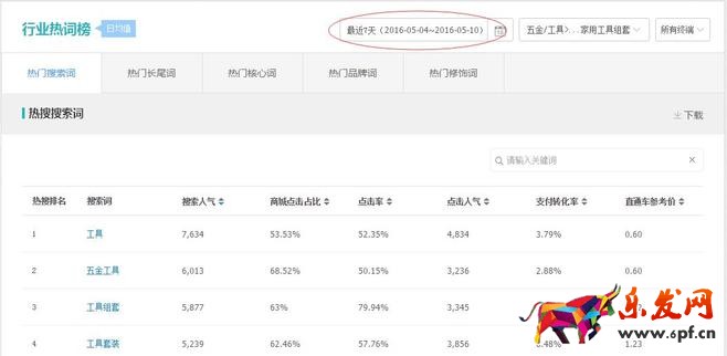 我們這里選取核心關鍵詞五金工具/工具組套/工具套裝三個關鍵詞,然后將我們選取的3個核心這里先保存,繼續打開我們生意參謀的搜索詞查詢,將剛才幾個詞手動輸入搜索查詢,如圖: