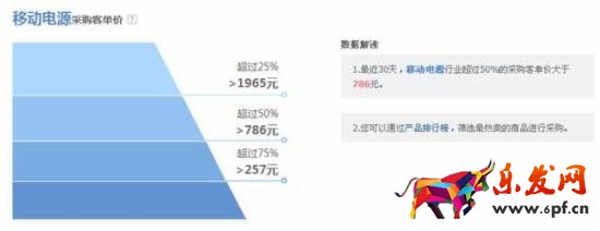 以圖可以看出,最近30天,移動電源行業超過50%的采購客單價大于786元。您可以通過產品排行榜,篩選最熱賣的商品進行采購。