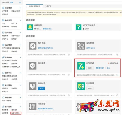 交完消保,順帶把運費險都給開通了。等有發布了寶貝后,再回來添加7+。