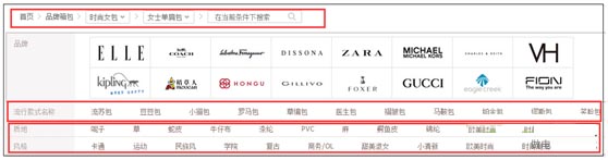 這是在正式搜索結果展示的上方出現的。為什么要出現這個呢(當然關鍵詞搜索也會出現,這是一樣的)?因為你點擊“單肩包”的時候,搜索引擎只知道你想要一個單肩包,但是你到底要一個什么樣子的單肩包(也就是更具體的屬性),它并不知道,那么搜索引擎為了給用戶更好地搜索體驗,他就先把可能會影響你購買的重要屬性值羅列出來,供你進行深度篩選。比如流行款式、質地、風格等等。這一切的一切,都是為了良好的用戶購物體驗。