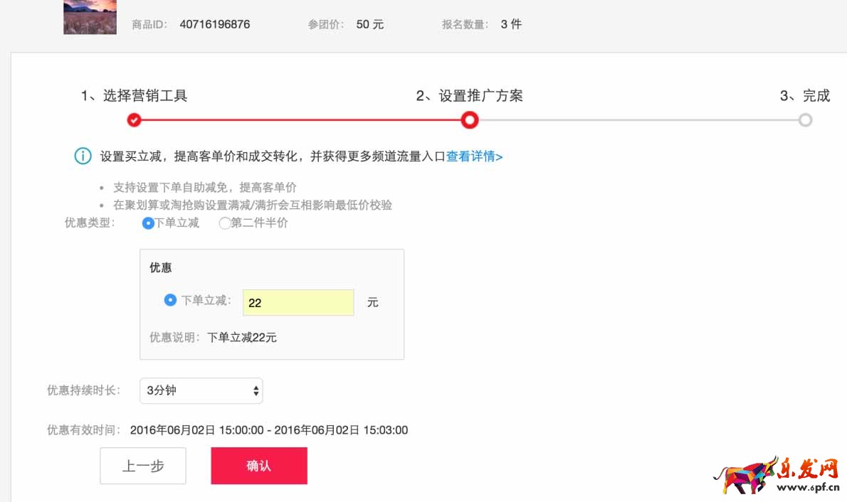 “下單立減”:如下圖設置,即表示在搶購開團后的3分鐘內,消費者下單立減22元,不限數量僅限制時間,3分鐘后,優惠結束。