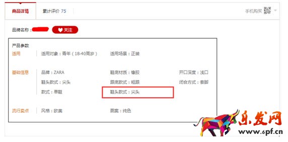 再上傳寶貝的時候,會先填寫寶貝的類目和屬性,多數屬性是淘寶已經給了的,我們去選擇,比如鞋頭款式這個屬性,下面就有:尖頭、圓頭、魚嘴、方頭等等。選好并發(fā)布商品后,在前臺寶貝詳情處就會體現出來,如下圖: