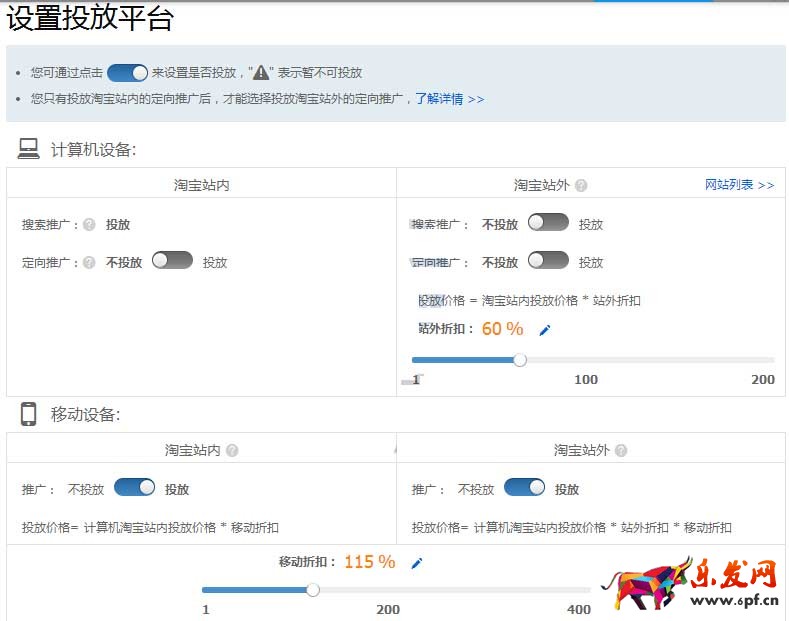 1、設(shè)置投放平臺:目前投放的分為淘寶站內(nèi)跟淘寶站外,淘寶站內(nèi)是必選的平臺,站外選項(xiàng)淘寶站外是指跟淘寶網(wǎng)合作的推廣網(wǎng)站;前期建議可以選關(guān)閉站外的流量,先用站內(nèi)的流量把關(guān)鍵詞的質(zhì)量分等數(shù)據(jù)給做起來先,再根據(jù)店鋪需求選擇要不要開啟站外。站內(nèi)站外有分別有定向推廣跟搜索推廣,根據(jù)自己的預(yù)算去判定是否開始定向推廣。