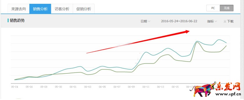4、生意參謀-經(jīng)營分析-商品效果里面選7天或者30天數(shù)據(jù)看(選多少天主要看店鋪的數(shù)據(jù)量,量大的7天就可以了),按訪客排序看那些寶貝的轉(zhuǎn)化率、收藏加車、高于全店平均的轉(zhuǎn)化率、收藏加車。然后點(diǎn)擊進(jìn)去單品分析看流量走勢如果是上升的,這些款可以暫定為潛力寶貝。如果轉(zhuǎn)化率是高于全店平均,但是流量是平穩(wěn)或者是下滑的這些怎么辦呢?平穩(wěn)的可以放到車上作為輔推款,先給一點(diǎn)流量看看數(shù)據(jù)情況在做定奪。下滑的就不要上車了,因?yàn)槊總€寶貝都會想拋物線一樣有一個壽命期。(圖一,圖二)