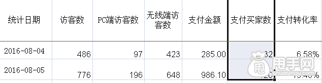 8月3號(hào)無線端訪客數(shù)38,下單買家1人,支付轉(zhuǎn)化率2.63%。8月22號(hào)無線端訪客是有達(dá)到405人。
