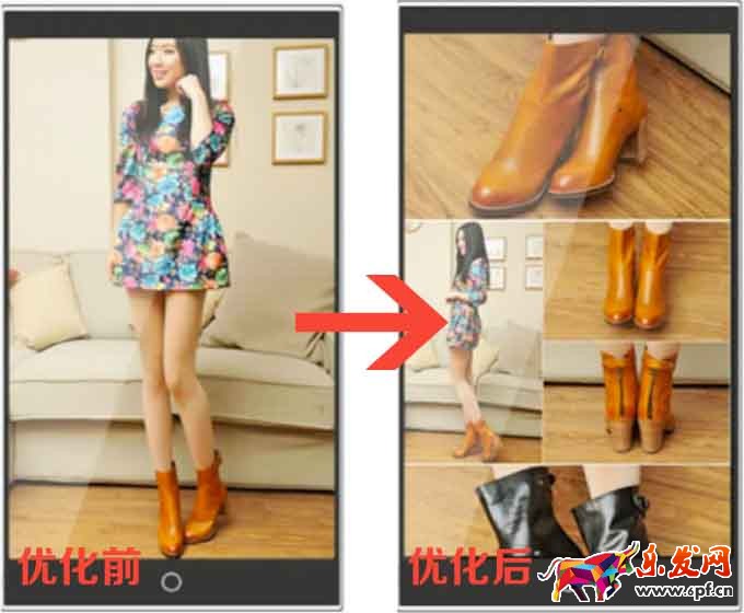 我們都知道PC端的畫面呈現是橫向的,而無線端是縱向的,兩者在呈現效果上是完全不同的。因此在無線端展示產品時我們一定要堅持“豎屏理論”,即拍攝照片時盡量用縱向的布局模式拍,保證可視范圍內的圖片的清晰度。