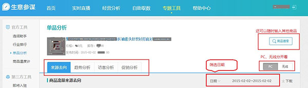 在我們做淘寶的時候,有的類目可能一個寶貝會有多個SKU,那寶貝有多個SKU詳情頁的順序該如何去策劃呢?假如說我們自己的寶貝有好幾個顏色,我們要將賣的最好的顏色進行重點的描述,像賣的比較少的顏色我們就可以描述的少一點,甚至不描述。那么我們如何選擇寶貝中賣的比較好的SKU呢,這里會用到一個工具,就是生意參謀。在專題工具里面,打開單品分析,在單品分析里面找到相對應的寶貝,然后進行銷售分析。