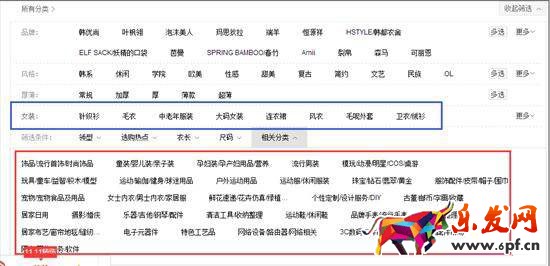 看藍框和紅框,紅框那一大批,也就是對于“毛衣女”這個關鍵詞來講,紅框里面的一大批類目里面的寶貝,即使你包含“毛衣女”這個關鍵詞,你也不可能有被展現的機會。換句話來說,放在這些類目里面的寶貝,都對你構不成任何競爭(前提是你的類目填寫正確了)。