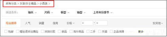 然后你點擊里面的前臺類目,比如你點擊“小西裝”,出現搜索結果頁,然后你在搜索結果頁有沒有跟你一樣(或者相似的寶貝),如果沒有的話就換一下,點擊別的,如果有的話,你就看一下搜索結果頁的右上角,下圖紅框里面的東西,那就是你要選擇的類目。
