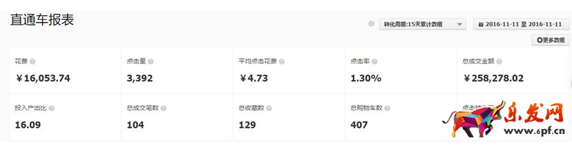 直通車和鉆展是我們店鋪主要的2個付費推廣工具,正常每天直通車的日限額在3000左右,因為推廣的產(chǎn)品比較多,所以我們的主推款每天也就500-1000的推廣費用,平時的平均點擊花費在2塊錢左右,在這個類目算是一般。下面是我雙11當天的直播通車報表。