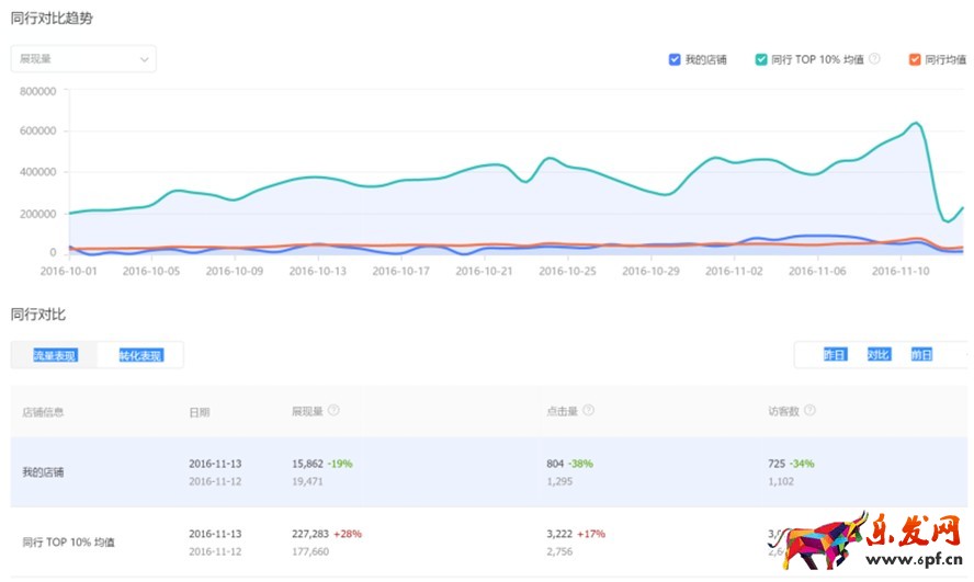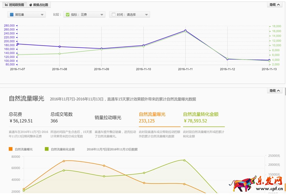 這是我截取最近七天的直通車后臺,顯示從11.07到11.13號,數(shù)據(jù)曲線顯示從雙11過后展現(xiàn)量和花費全部都降低了很多,反映出,直通車專員在雙11之后對于直通車這款沒有進行好的推廣,或者是說沒錢花了,導致雙11之后的展現(xiàn)很低。另外雙11過程中,直通車整體的權(quán)重是很高的,但是如果后面不接著推廣的話,之前累計的權(quán)重也會很快的消失,所以還是要進行推廣的,這也是一次建議,就是說大家在雙12結(jié)束后也是一定繼續(xù)推廣的!