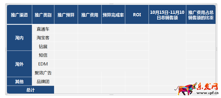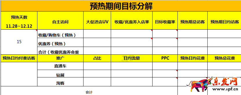 分析完以上之后,我們再來分析推廣方面的,首先肯定有人會問,為什么會有兩個表格?那是因為分了兩個不同的階段,分別為預熱期和高潮期,預熱期顧名思義就是大促前的預熱和預告,整個預熱期都是在為雙11當天爆發做基礎,所以這個時期所需要做的事情都是圍繞著雙11當天去進行的,雙11是否能完成目標也是與預熱時期做的所有息息相關。(ps:沒有的數據可以空著,根據店鋪做過的推廣方式來填寫數據)