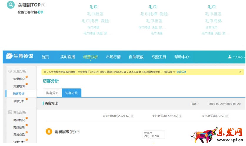 進入生意參謀主頁面之后,在導航欄里有“經營分析”這個選項,點開之后在左側的菜單欄有“訪客分析”,點開之后選擇“訪客對比”拉到最下面會看到“關鍵詞TOP”,選擇最近30天的數據,可以看到店鋪訪客最近30天最常搜索的詞,可以把這些詞加進直通車進行測試,分數高的保留。