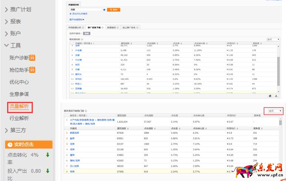 進入直通車,在左側菜單欄有個工具選項,下拉框里有“流量解析”,在這里輸入寶貝的主要關鍵詞,點擊查詢之后會有出現一些信息,包括“市場數據分析”“推廣詞表下載”“數據透視”“線上推廣排名”,添加關鍵詞時可以根據“推廣詞表下載”中“相關詞分析”和“相關類目下的熱門詞”提供的關鍵詞進行添加,選擇一些合適的進行測試。