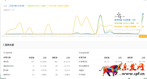 再看一個寶貝,在前面很長一段時間內,差不多都是0流量的,偶爾有一兩個,突然從5月9日開始爆發了,當天賣了400多件。從流量來源看百分之八十的流量都是來自于淘搶購,無論是手機端還是PC端,訪客數和瀏覽量都暴漲,這就是活動帶給我們的效果和威力。