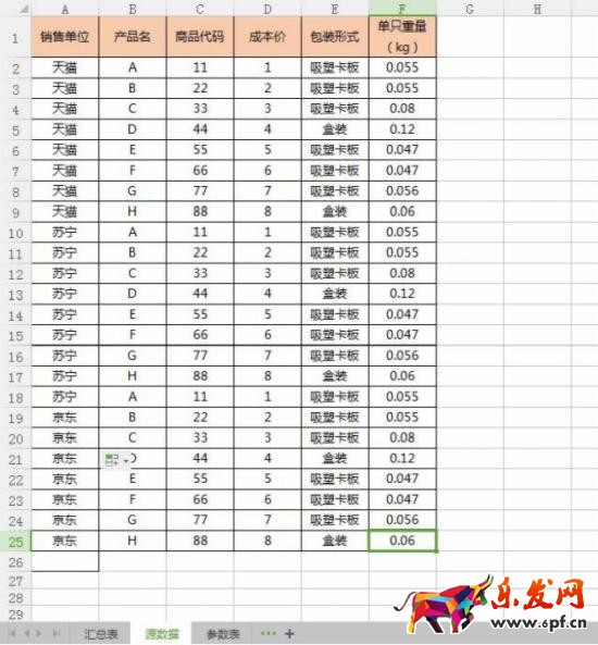 如果做好工具表,那么下載完寶貝訂單,根據商家編碼就可以匹配出成本了,工具表其實可以參考東哥的修改就行,只是在前面增加商家編碼即可,如下: