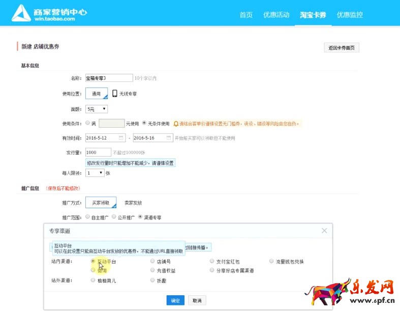 那么如何去設置店鋪寶箱呢?店鋪寶箱的設置要配合優惠券和獎池。這里的優惠券和其他的優惠券的使用時不同的,打開淘寶卡券-創建店鋪優惠券,在設置優惠券的面額時,如果設置的面額較大時,就會促進店鋪的轉化,拉升寶貝的權重。特別要注意的是在選擇推廣范圍時要選擇渠道專享中的互動平臺。