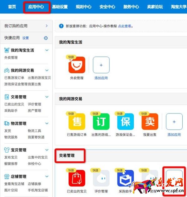 設置方法:1)首先需要訂購花唄的商家才可使用,否則設置界面無法使用;2)賣家需要打開新版賣家中心,如下圖顯示,點擊應用中心,選擇交易管理,選擇分期管理應用