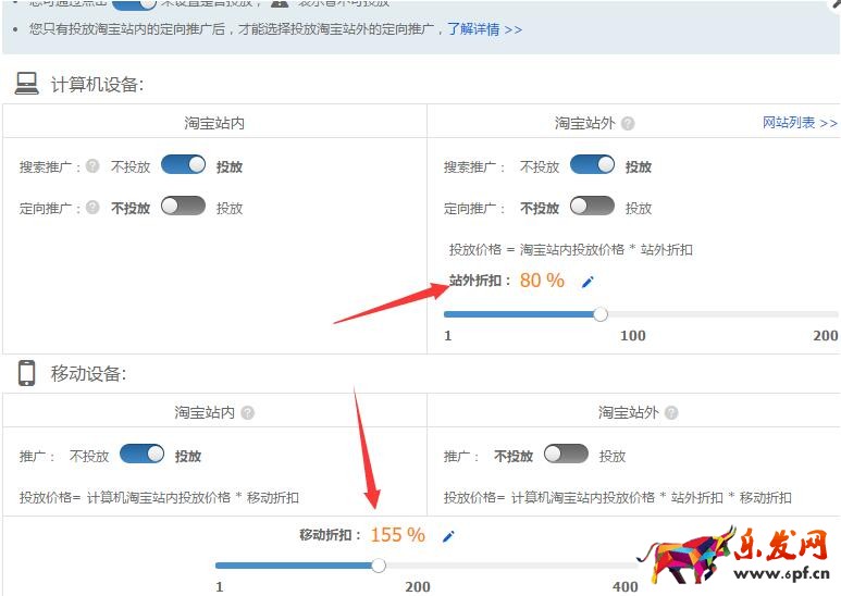 很簡(jiǎn)單,設(shè)置好折扣比例就行了,比如,我無(wú)線設(shè)置折扣155%,站外設(shè)置折扣80%.