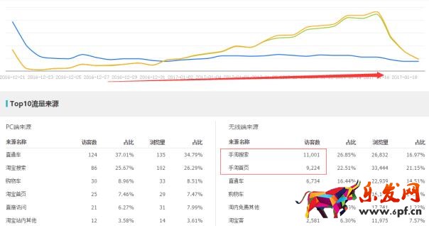 1.手淘搜索,這個就是關鍵詞,你投放直通車關鍵詞,這方面流量會漲的很快。這部分流量的轉化率很高。