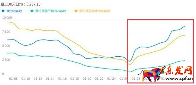 都是在我們運營做完優化后,上漲后有一定的回落,這個也正常,但是回落數據也比上升之前是要高的,春節后,我的訪客就持續高于我同層優秀了。目前這個店鋪的搜索訪客數據就是:上升-回落一點-穩定-再上升-再穩定。