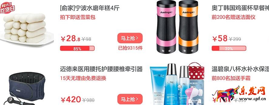 各位商家在報名參加淘搶購活動時,可以額外上傳一張商品素材圖,將有機會在手淘首頁的淘搶購業務入口展現而獲得超大流量(買家對某個類型的商品感興趣,就會推薦在活動當天上線的相關商品,千人千面,每個買家會看到不同的商品,例如買家對鞋的商品比較感興趣,就會推薦當天鞋類的商品),如下位置: