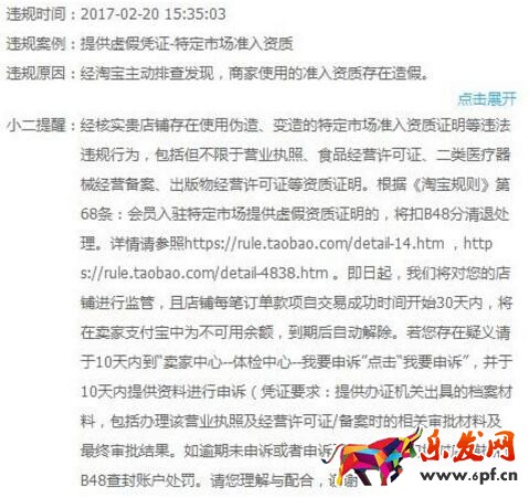 淘寶對某店家違規的反饋