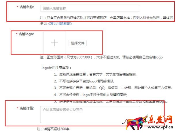 上傳完入駐資質(zhì)后,進(jìn)入到填寫店鋪信息階段,商家只需要填店鋪名、上傳店鋪 logo、補(bǔ)充店鋪詳情說明即可。具體嗎,按照頁面上標(biāo)注的格式要求填寫。