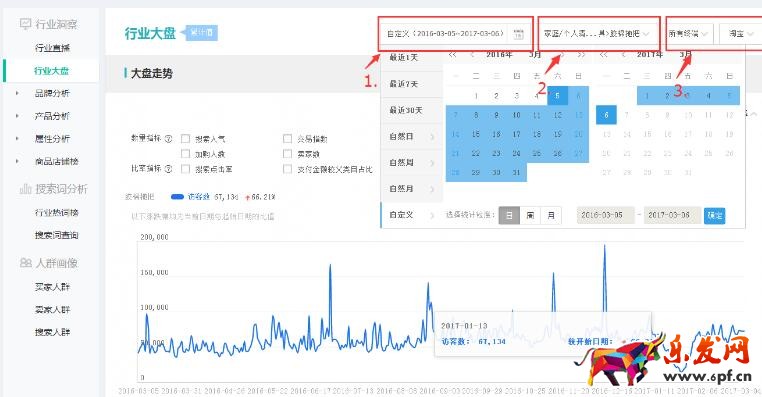 生意參謀是淘寶的官方數據工具,是比較權威的數據發布中心,其屬于收費工具。在生意參謀市場行情模塊中找到行業大盤,如圖: