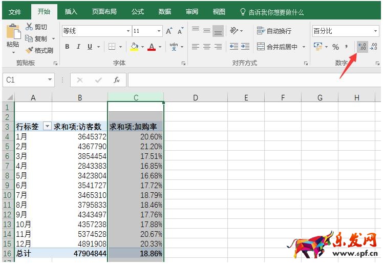 點擊確定之后,如下圖所示,將加購率所在的C列轉換成百分比顯示格式: