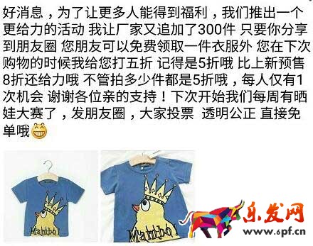 一切準(zhǔn)備就緒,只欠東風(fēng)。我們需要的是激活這個(gè)店鋪。其實(shí)就是說怎么激活那些粉絲。我們這什么都沒,就是不缺童裝,馬上去市場(chǎng)看貨準(zhǔn)備進(jìn)一批的人家倒閉甩貨的短袖(1.便宜,是真便宜,比看到的9.9包郵的還便宜,面料做工還算過得去2.款式我肯定還是選品牌定制的那種啊,選了一款比較流行爆款T恤)直接吃下了3100件。