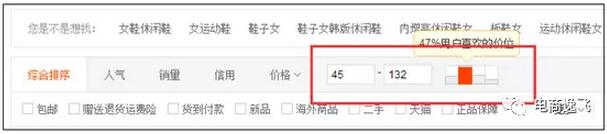 所以這里告訴大家一個非常簡單的小方法,去制定合理的價格區(qū)間。你總該要知道你準備銷售的真實價格吧,然后你在搜索結(jié)果頁看看你這個價格在哪個價格柱,你點擊一下那個價格柱。比如,我們以“休閑鞋女”為例,你準備賣128元錢,看下圖紅框中: