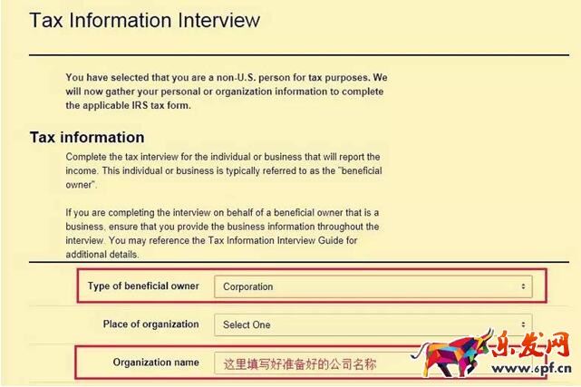 4. 然后進入Tax Information Interview頁面,請注意,填寫Type of beneficial owner 信息欄時,右側需要選擇Corporation,并在Organization Name信息欄填寫好準備好的公司資質的公司名,如圖: