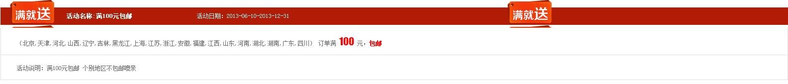 <table background="http://img02.taobaocdn.com/imgextra/i2/1640026267/T2fs6FXXdbXXXXXXXX-1640026267.jpg" class="" height="28" width="100%"> <tbody> <tr> <td> <div style="height:28px;padding:23px 0 0 130px;"> <span style="line-height:14px;color:#FFFFFF;font-size:12px;font-weight:bold;">活動名稱:滿100元包郵</span><span style="line-height:14px;color:#FFFFFF;font-size:12px;padding-left:130px;">活動日期:2013-06-10-2013-12-31</span></div> </td> </tr> </tbody> </table> <div style="width:92.8%;border:1px solid #E0E0E0;border-top:0;float:left;padding:14px 5% 10px 2%;"> <span style="font-size:12px;color:#666666;line-height:25px;">(北京,天津,河北,山西,遼寧,吉林,黑龍江,上海,江蘇,浙江,安徽,福建,江西,山東,河南,湖北,湖南,廣東,四川) 訂單滿 <font style="font-size:20px;font-family:impact;color:red;">100</font> 元,<font style="color:red;font-weight:bold;">包郵</font></span></div> <div style="width:92.8%;border:1px solid #E0E0E0;border-top:0;float:left;padding:14px 5% 10.0px 2%;"> <span style="font-size:12px;color:#666666;line-height:25px;">活動說明:滿100元包郵 個別地區不包郵噢親</span></div>