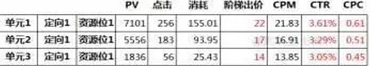 投放后,對比三個單元的投放數(shù)據(jù),確定最適合的出價。