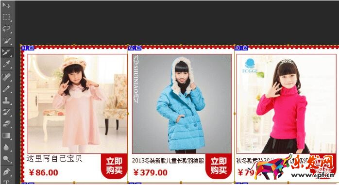 這樣我們就可以看到該寶貝圖片的位置大小,接下來我們就可以把自己店鋪的寶貝圖片制作成與模板圖片的大小一樣,這樣我們就可以把自己的寶貝圖片很吻合的放入模板中。