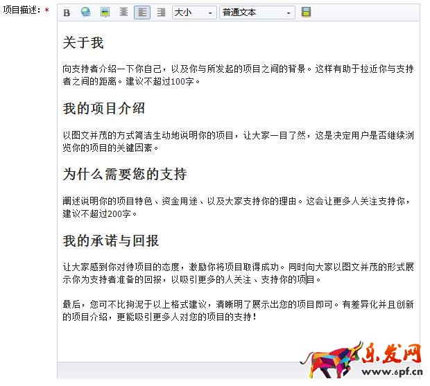 關(guān)于項目描述,官方給出了一個通版(截圖上有),大家可以參考一下去做,這樣眾籌的通過率高一些。(不要在項目描述上添加你的二維碼,公司信息,電話,QQ等,小二是不會讓你過的)