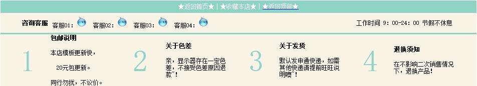 <table border="0" width="950" cellpadding="0" cellspacing="0"> <tbody> <tr> <td bgcolor="#000000" height="25"> <table border="0" width="950" cellpadding="0" cellspacing="0"> <tbody> <tr> <td bgcolor="#8dd4c4" width="270">   </td> <td align="center" bgcolor="#8dd4c4" height="25" valign="center" width="410"> <p align="center"><span><span style="font-size:12px;"><span style="color:rgb(255,255,255);">★返回首頁★</span><span style="color:rgb(255,255,255);">丨</span><span style="color:rgb(255,255,255);">★收藏本店★</span><span style="color:rgb(255,255,255);">丨</span><a href="#" data-cke-saved-href="#"><span style="color:rgb(255,255,255);">★返回頂部★</span></a></span></span></p> </td> <td bgcolor="#8dd4c4" width="270"> <span style="color:rgb(0,0,0);"><span><span style="font-size:12px;"> </span></span></span> </td> </tr> </tbody> </table> </td> </tr> <tr> <td bgcolor="#ffffff" height="40"> <table border="0" width="950" cellpadding="0" cellspacing="0"> <tbody> <tr> <td bgcolor="#faf4e6" width="34"> <span style="color:rgb(0,0,0);"><span><span style="font-size:12px;"> </span></span></span> </td> <td align="center" bgcolor="#faf4e6" valign="center" width="70"> <strong><span style="color:rgb(0,0,0);"><span><span style="font-size:12px;">咨詢客服</span></span></span></strong> </td> <td align="left" bgcolor="#faf4e6" height="40" valign="center" width="537"> <div> <span style="color:rgb(0,0,0);"><span><span style="font-size:12px;">客服01:<img src="http://img04.taobaocdn.com/tps/i4/T1YNJJXfFHXXXXXXXX-21-21.gif" data-cke-saved-src="http://img04.taobaocdn.com/tps/i4/T1YNJJXfFHXXXXXXXX-21-21.gif" /> 客服02:<img src="http://img04.taobaocdn.com/tps/i4/T1YNJJXfFHXXXXXXXX-21-21.gif" data-cke-saved-src="http://img04.taobaocdn.com/tps/i4/T1YNJJXfFHXXXXXXXX-21-21.gif" /> 客服03:<img src="http://img04.taobaocdn.com/tps/i4/T1YNJJXfFHXXXXXXXX-21-21.gif" data-cke-saved-src="http://img04.taobaocdn.com/tps/i4/T1YNJJXfFHXXXXXXXX-21-21.gif" /> 客服04:</span></span></span><img src="http://img04.taobaocdn.com/tps/i4/T1YNJJXfFHXXXXXXXX-21-21.gif" data-cke-saved-src="http://img04.taobaocdn.com/tps/i4/T1YNJJXfFHXXXXXXXX-21-21.gif" /> </div> </td> <td bgcolor="#faf4e6" width="69"> <span style="color:rgb(0,0,0);"><span><span style="font-size:12px;"> </span></span></span> </td> <td align="left" bgcolor="#faf4e6" valign="center" width="201"> <div> <span style="color:rgb(0,0,0);"><span><span style="font-size:12px;">工作時(shí)間 9:00-24:00 節(jié)假不休息</span></span></span> </div> </td> <td bgcolor="#faf4e6" width="39"> <span style="color:rgb(0,0,0);"><span><span style="font-size:12px;"> </span></span></span> </td> </tr> </tbody> </table> </td> </tr> <tr> <td bgcolor="#ffffff"> <div style="border-bottom:#8DD4C4 1px solid;border-top:#8DD4C4 3px solid;"> <table border="0" width="950" cellpadding="0" cellspacing="0"> <tbody> <tr align="left" valign="center"> <td bgcolor="#faf4e6" height="100" width="20"> <span style="color:rgb(0,0,0);"><span><span style="font-size:12px;"> </span></span></span> </td> <td style="text-align:center;" bgcolor="#faf4e6" width="70"> <span style="color:#8DD4C4;"><span style="font-size:60px;"> 1</span></span> </td> <td bgcolor="#faf4e6" width="9"> <span style="color:rgb(0,0,0);"><span><span style="font-size:12px;"> </span></span></span> </td> <td bgcolor="#faf4e6" width="125"> <p><strong><span style="color:rgb(0,0,0);"><span><span style="font-size:12px;">包郵說明</span></span></span></strong></p> <p><span style="color:rgb(0,0,0);"><span><span style="font-size:12px;">本店模板更新快,</span></span></span></p> <p><span style="color:rgb(0,0,0);"><span><span style="font-size:12px;"> 20元包更新。   </span></span></span></p> <p><span style="color:rgb(0,0,0);"><span><span style="font-size:12px;">同行勿擾,不議價(jià)。</span></span></span></p> </td> <td bgcolor="#faf4e6" width="23"> <span style="color:rgb(0,0,0);"><span><span style="font-size:12px;"> </span></span></span> </td> <td style="text-align:center;" bgcolor="#faf4e6" width="71"> <span style="color:#8DD4C4;"><span style="font-size:12px;"><span style="font-size:60px;">2</span></span></span> </td> <td bgcolor="#faf4e6" width="9"> <p> </p> </td> <td bgcolor="#faf4e6" width="124"> <p><strong><span style="color:rgb(0,0,0);"><span><span style="font-size:12px;">關(guān)于色差</span></span></span></strong></p> <p><span style="color:rgb(0,0,0);"><span><span style="font-size:12px;">親,顯示器存在一定色差,不接受色差原因退款~!</span></span></span></p> </td> <td bgcolor="#faf4e6" width="24"> <span style="color:rgb(0,0,0);"><span><span style="font-size:12px;"> </span></span></span> </td> <td style="text-align:center;" bgcolor="#faf4e6" width="71"> <span style="color:#8DD4C4;"><span style="font-size:12px;"><span style="font-size:12px;"><span style="font-size:60px;">3</span></span></span></span> </td> <td bgcolor="#faf4e6" width="9"> <span style="color:rgb(0,0,0);"><span><span style="font-size:12px;"> </span></span></span> </td> <td bgcolor="#faf4e6" width="124"> <p><strong><span style="color:rgb(0,0,0);"><span><span style="font-size:12px;">關(guān)于發(fā)貨</span></span></span></strong></p> <p><span style="color:rgb(0,0,0);"><span><span style="font-size:12px;">默認(rèn)發(fā)申通快遞,如需其他快遞請?zhí)崆巴f明噢~!</span></span></span></p> </td> <td bgcolor="#faf4e6" width="24"> <span style="color:rgb(0,0,0);"><span><span style="font-size:12px;"> </span></span></span> </td> <td style="text-align:center;" bgcolor="#faf4e6" width="71"> <span style="color:#8DD4C4;"><span style="font-size:12px;"><span style="font-size:12px;"><span style="font-size:12px;"><span style="font-size:60px;">4</span></span></span></span></span> </td> <td bgcolor="#faf4e6" width="9"> <span style="color:rgb(0,0,0);"><span><span style="font-size:12px;"> </span></span></span> </td> <td bgcolor="#faf4e6" width="124"> <p><strong><span style="color:rgb(0,0,0);"><span