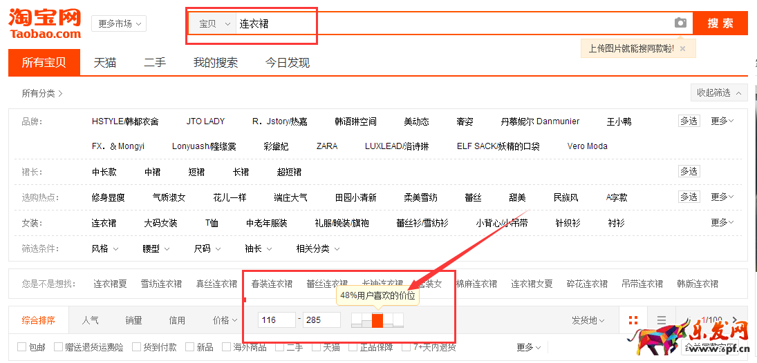 首先需要分析你的行業什么樣的價格比較受買家喜歡,什么樣的價格買家購買人數占比多,很多小伙伴都不知道怎么看,那么小編教你怎么去看你行業什么價格比較好。下面就以連衣裙為例。下面這張圖很容易看出,連衣裙價格在116-285區間有一般的用戶喜歡,那么我們可以把價格定在這個區間,但是如果你的寶貝不是這個區間價格的,你非要設置在這個價格區間,那也是不行的,要結合你的寶貝自身價值。那你在找貨源的時候可以往這個價格區間靠。