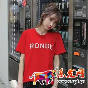 圖8中紅色女裝T恤,也是利用了中心構(gòu)圖法,但由于拍攝時選擇了相對凌亂的背景,同時沒有使用背景模糊等處理方法,使得畫面看起來雜亂,中間的模特相比較圖7中的模特就弱化了許多。同時背景上也有一些較明顯的色塊,容易分散人的注意力,如果同圖7那樣,將背景弱化一下或者換一個簡單明了的背景,畫面主體會更加突出。