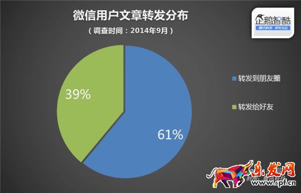 微信用戶看到了想要轉發的文章,61%轉發到了朋友圈,39%的文章轉發給好友。有目標性地分享可以看成是微信用戶分享文章的特點,雖然轉發到朋友圈可以讓更多朋友看到,但依舊有接近40%的內容轉發給好友。
