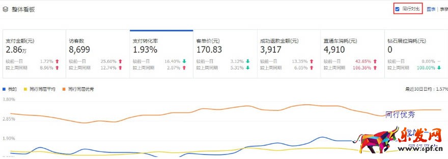 轉化率我們可以到生意參謀首頁的整體看板中進行查看。高于同行業平均水平,再結合上面的加車收藏率接近行業的一半左右時,寶貝就更加的毫不猶豫的推了。