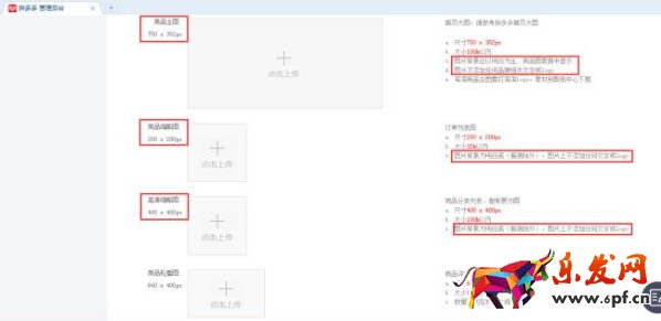 商品主圖的大小是750*352px,略縮圖為200*200px,高清略縮圖為400*400px,三張圖都必須是無logo、無文字的白底圖;商品輪播圖尺寸為640*400px,展示在商品詳情頁上方,兩邊留白不能太多;詳情頁的圖片建議用PS制作,尺寸為640*960px,大小不得超過100kb,數量控制在3-20張左右。