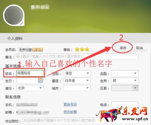 我們可在姓名那一欄輸入自己喜歡的個性姓名,例如我們輸入“阿里旺旺”,輸入完成后點擊“保存”。修改完成后,我們就會發現軟件中和聊天中顯示的名字即為剛剛我們修改后的名字。