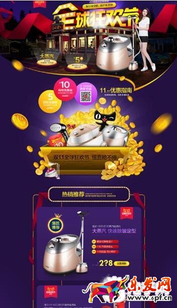 1、首頁:首先我們要輸說的是雙十一首頁的設計,通常首頁設計主要突出的就是雙十一的活動氛圍。多以喜慶絢麗的顏色為主。去年很流行的藍紫色漸變以及C4D制作的立體風格的產品BANNER等,無一不透露著活動的熱鬧和產品的琳瑯滿目。