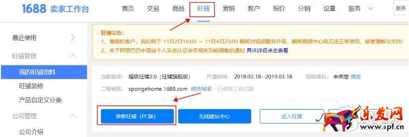 阿里巴巴店鋪裝修用到的用具叫旺鋪,它的入口在【賣家工作臺】-【旺鋪】-【裝修旺鋪(pc版)】,就能進入旺鋪裝修頁面了。如下圖: