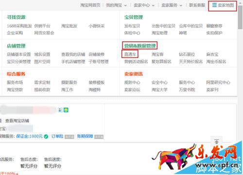 2、將鼠標移到【賣家中心】窗口右上角【賣家地圖】-【營銷&數據管理】-【直通車】。