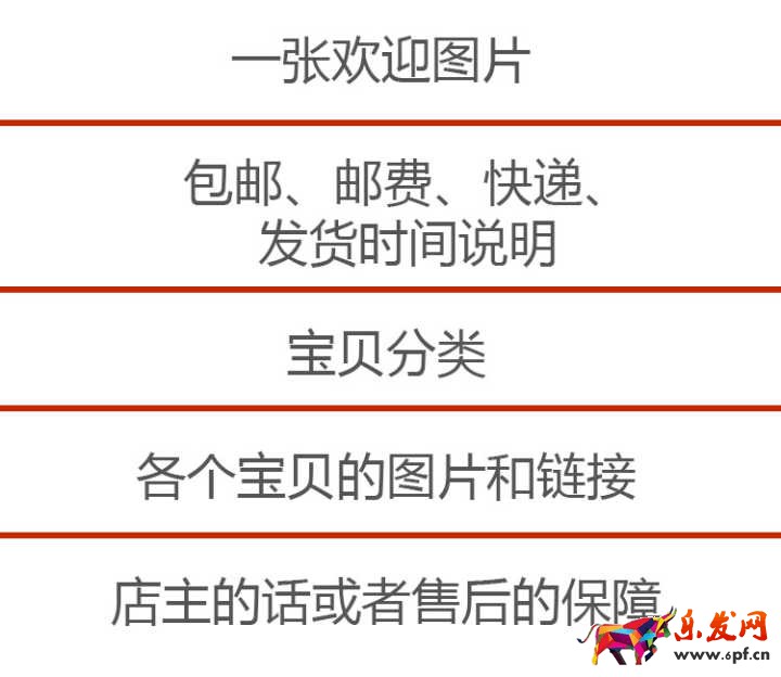 言歸正傳,那么裝修淘寶和裝修任何房間一樣,你要把想法先按照“模塊”來劃分。淘寶店的裝修其實很簡單,就是從上到下,你希望顧客在手指滑動的時候,依次看到什么。按照大部分模板和淘寶的功能,我們可以把布局給劃分成這樣: