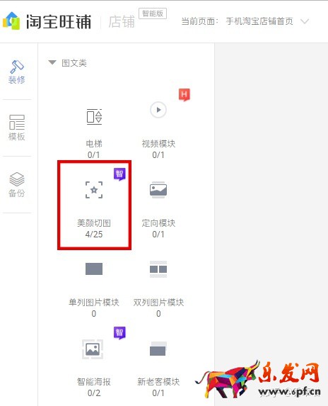 首先,打開淘寶的無線端裝修首頁,找到美顏切圖模塊。(開通了智能版才可以使用)