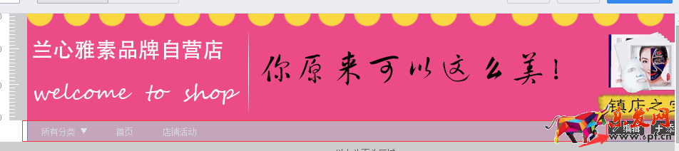 2.接著可以做店招了,店招只支持950的寬度,全屏顯示是1920.怎么破?原理很簡單,做一個1920的店招,取中間950放自己的內容。然后將1920整張設置為店招背景,再將950的部分裁出來上傳到店招的位置,就把背景重復的覆蓋掉了~~